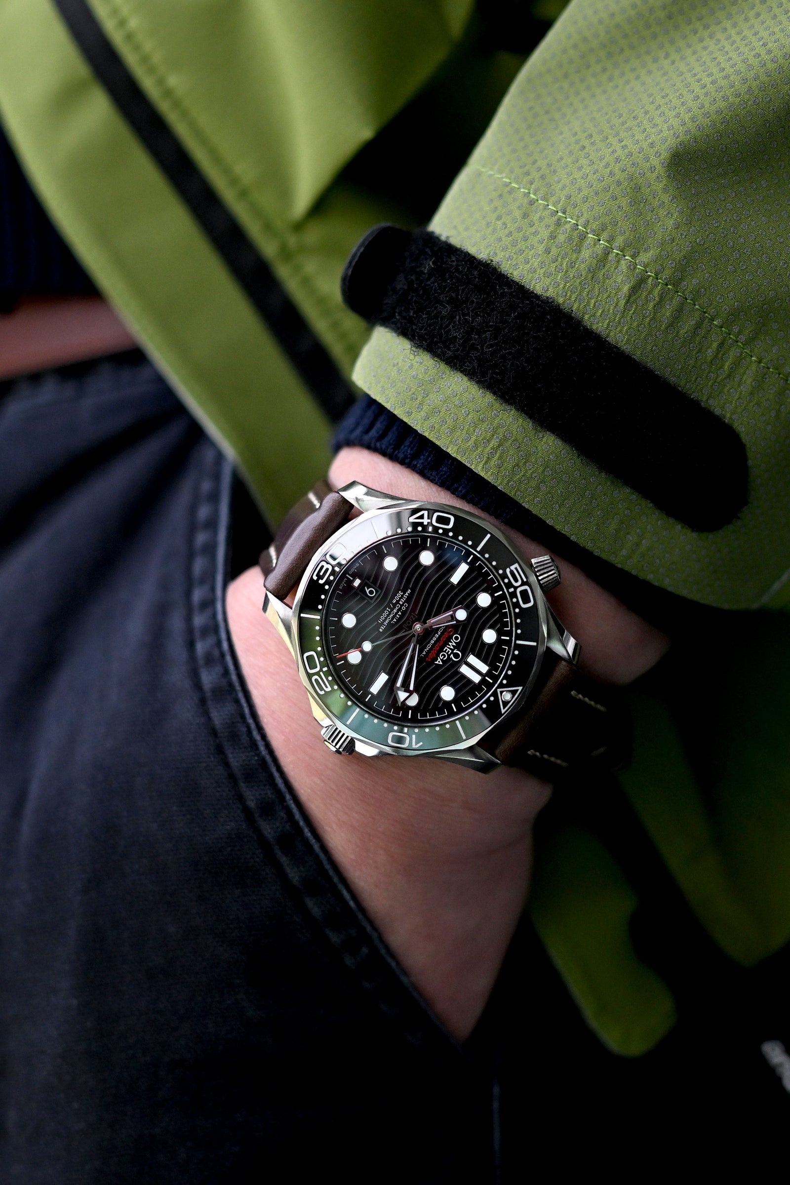 Emerald elegance meets oceanic precision - the Omega Seamaster Diver 300M commanding attention against the rich texture of that verdant jacket, while the supple Horween Chromexcel leather watch strap adds that earthy sophistication only true style enthusiasts understand when pairing bold outerwear with classic timepieces.