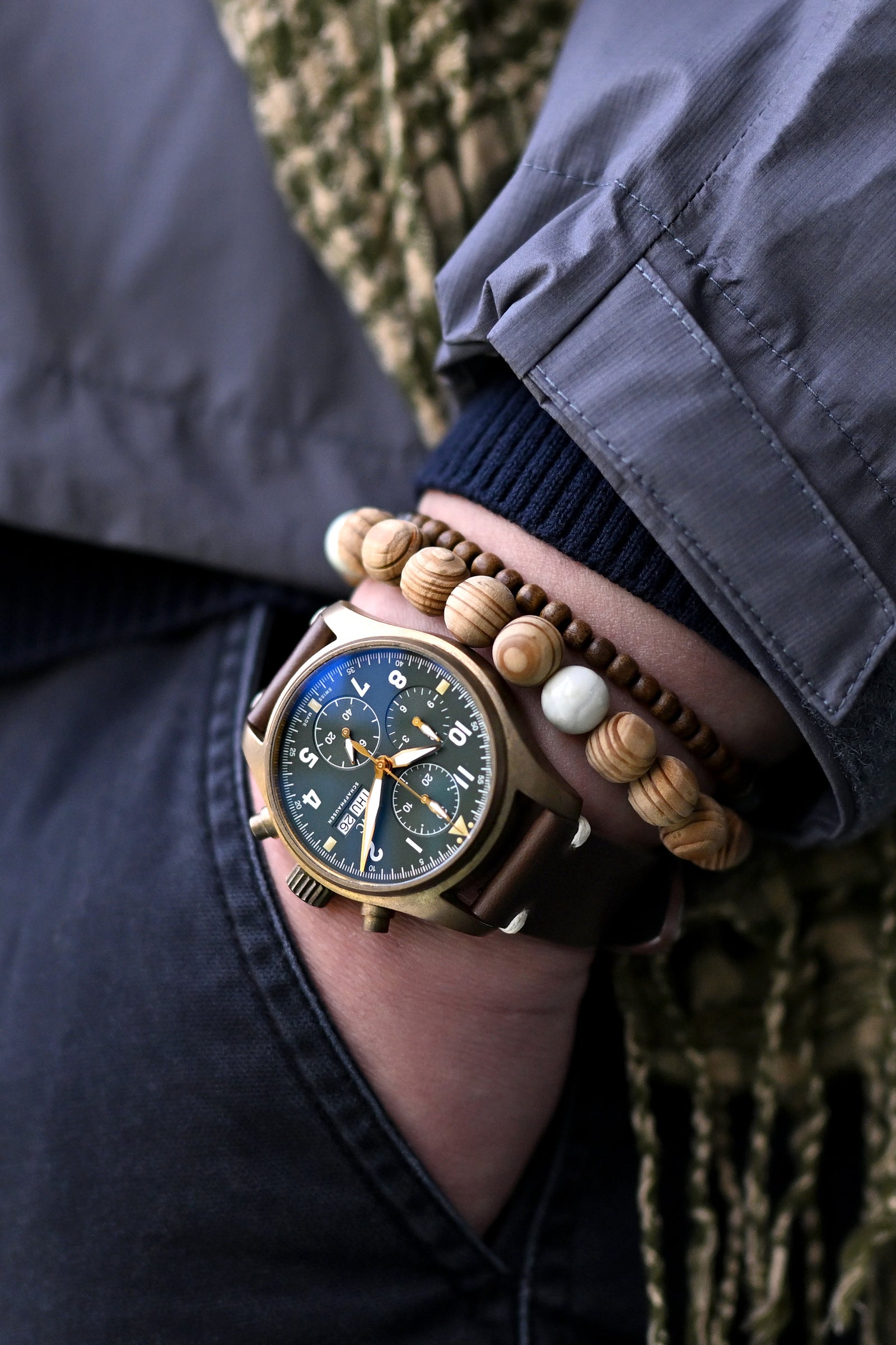 Studied nonchalance that only comes with confidence - the IWC Pilot Spitfire Chronograph Bronze developing its distinctive patina against the clean lines of that dark grey jacket, while the patterned cotton scarf introduces just enough visual interest to balance the Horween leather watch strap and natural wood accessories for effortless style that speaks volumes without saying a word.