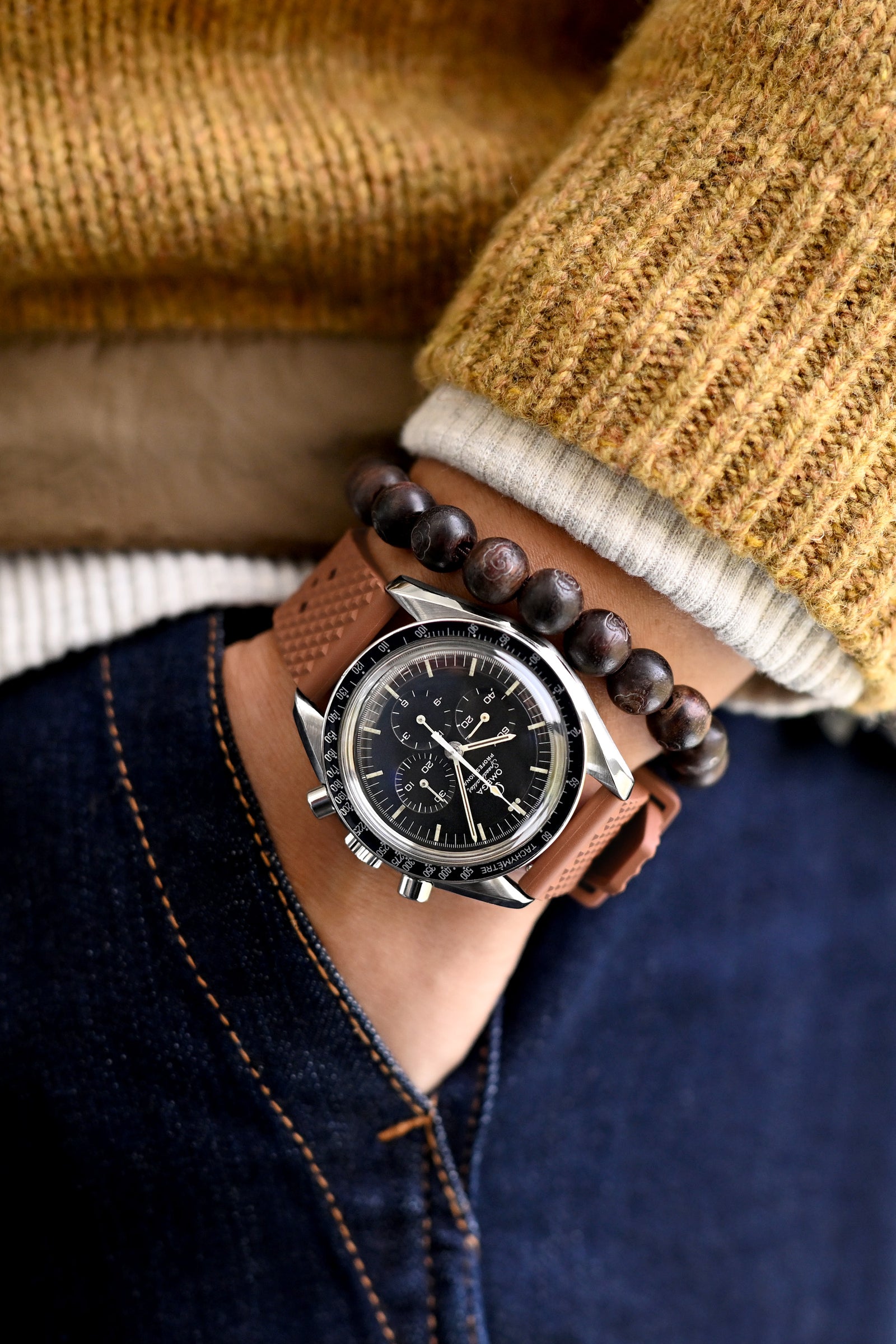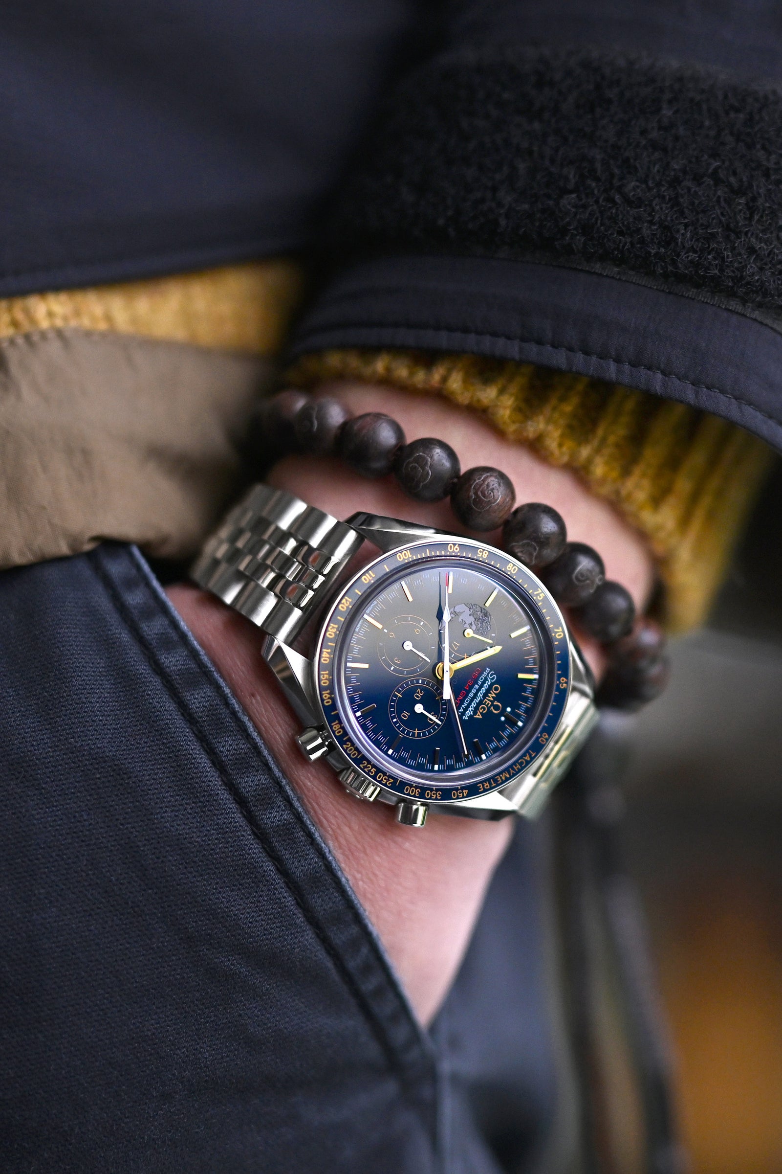 Technical layering mastered with thoughtful intention - the OMEGA Speedmaster Moonwatch Apollo XVII's titanium watch band creates a striking industrial harmony against the water-repellent jacket and cozy sweater combination, while Buddha beads introduce that contemplative element to this composed style arrangement, perfect for navigating between seasonal temperatures with effortless sophistication.