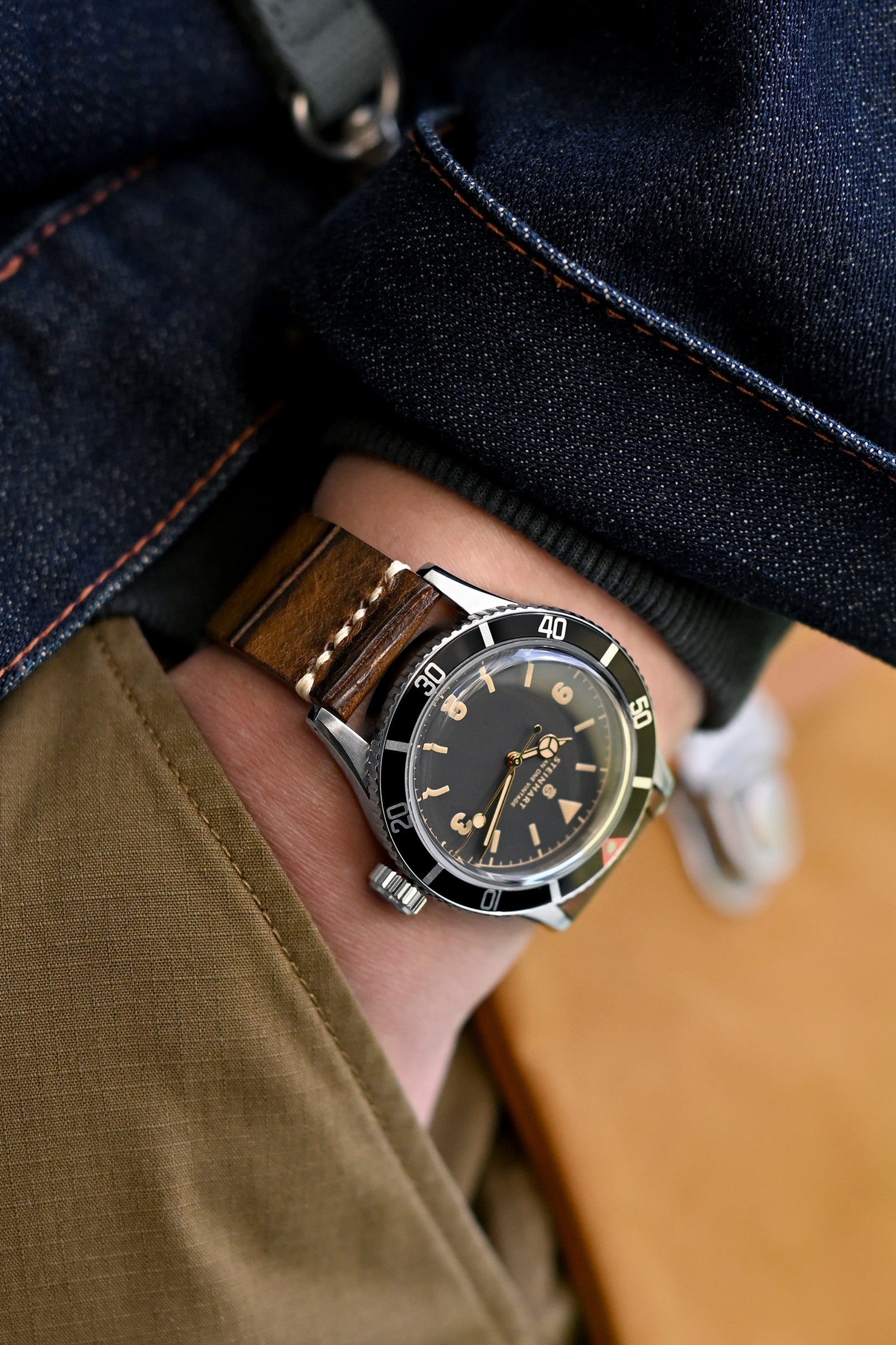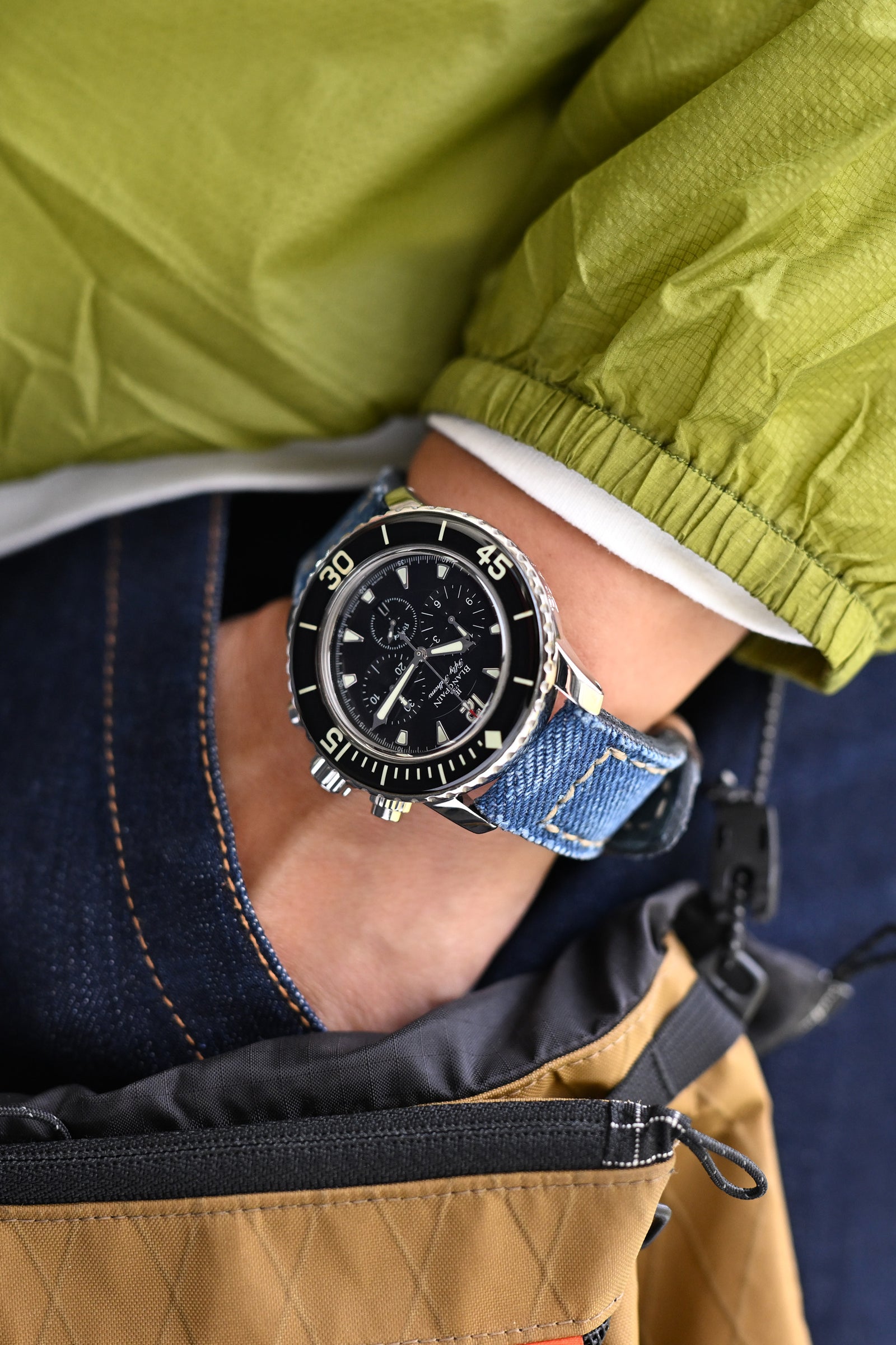 Weekend liberation captured - lightweight Skyflow jacket with its streamlined shoulder reinforcements providing the casual foundation for the formidable Blancpain Fifty Fathoms Flyback Chronograph, its precision mechanism complemented perfectly by the Gunny handmade Denim Blue Washed Canvas watch strap that's clearly seen some adventurous journeys through metropolitan landscapes.