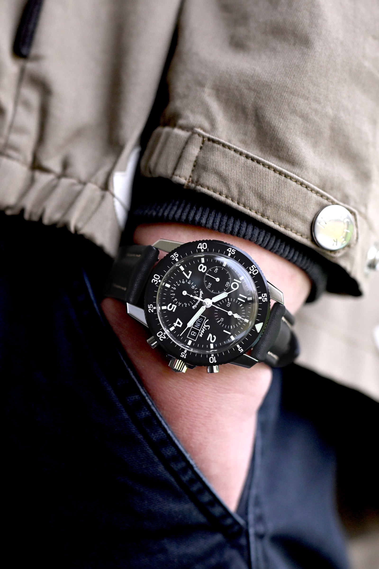 Heritage textures collide perfectly in this frame - vintage Oxford quilting with its characteristic diamond pattern creates the ideal canvas for the purposeful Sinn 103 ST Pilot Chronograph, with that handcrafted black French leather watch strap providing just the right monochromatic styling balance against the jacket's structured shoulders.