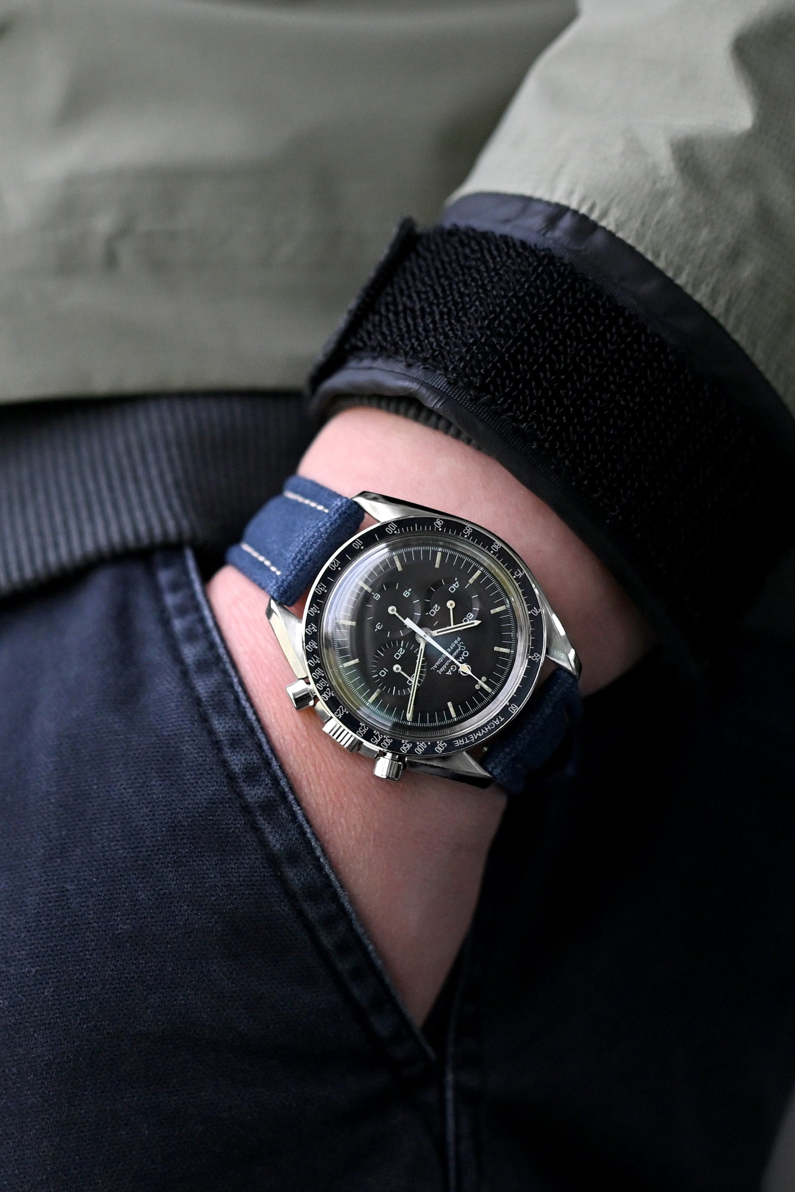 Urban functionality meets celestial history - the windbreaker's deep tones and low-profile technical fabrication create a subtle backdrop for the understated professional, allowing the legendary Omega Speedmaster Moonwatch 1969 to command attention without ostentation, while the navy canvas watch strap introduces that essential textural contrast for a refined aesthetic that transitions seamlessly from client meetings to evening engagements.