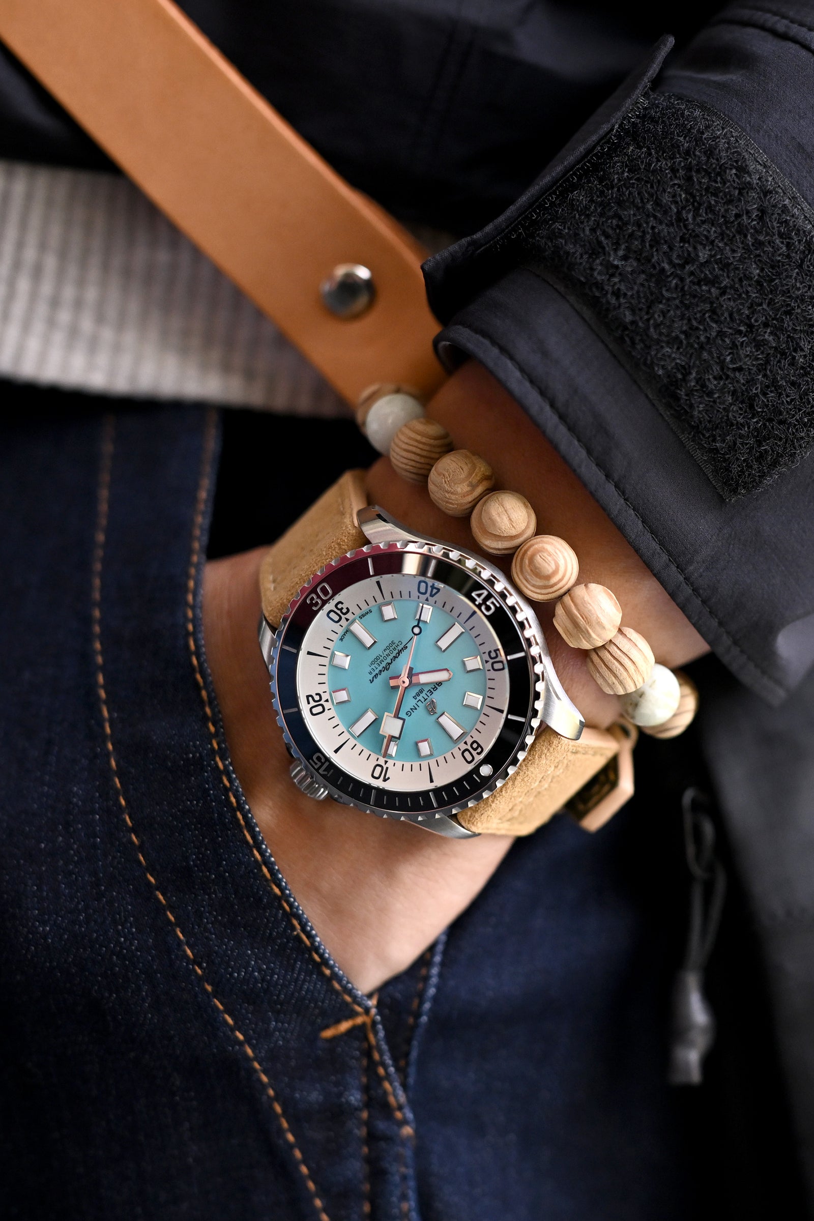 Monochromatic mastery with a splash of azure - the Breitling SuperOcean Automatic 44's unmistakable turquoise dial creates the perfect focal point against the sleek black jacket's minimalist silhouette and concealed pockets, with khaki Alcantara watch strap and Japanese cedar offering earthbound fashion balance to this oceanic timepiece for daily urban exploration.