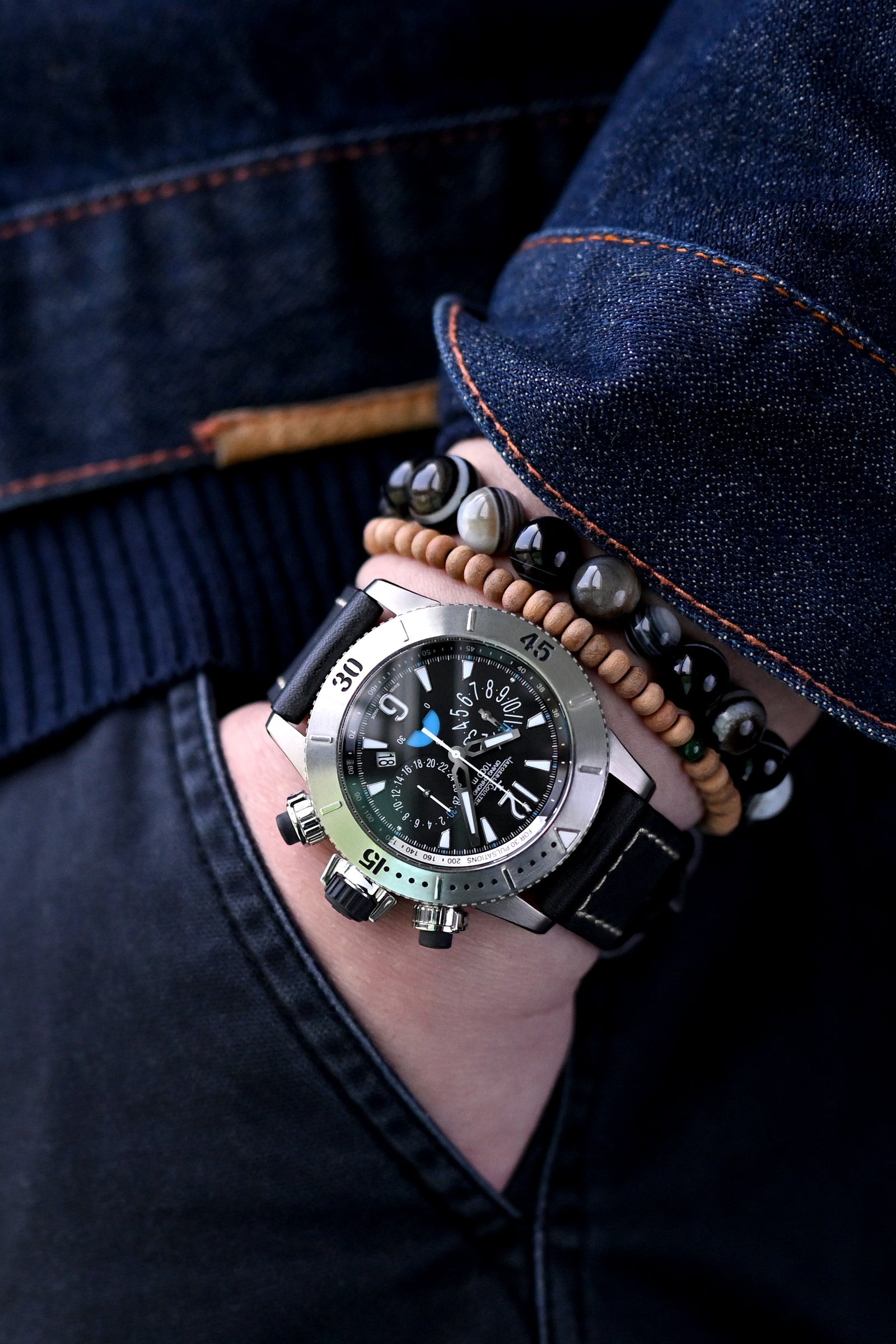 Raw materiality creating visual poetry - the Jaeger LeCoultre Master Compressor Diver Chronograph Titanium's case harmonizes with the iconic Evisu Denim jacket's street-style aesthetic, while tiger eye and agarwood beads introduce those mystical elements that complement the Barenia leather watch strap's storied patina for elevated style that tells a personal story.