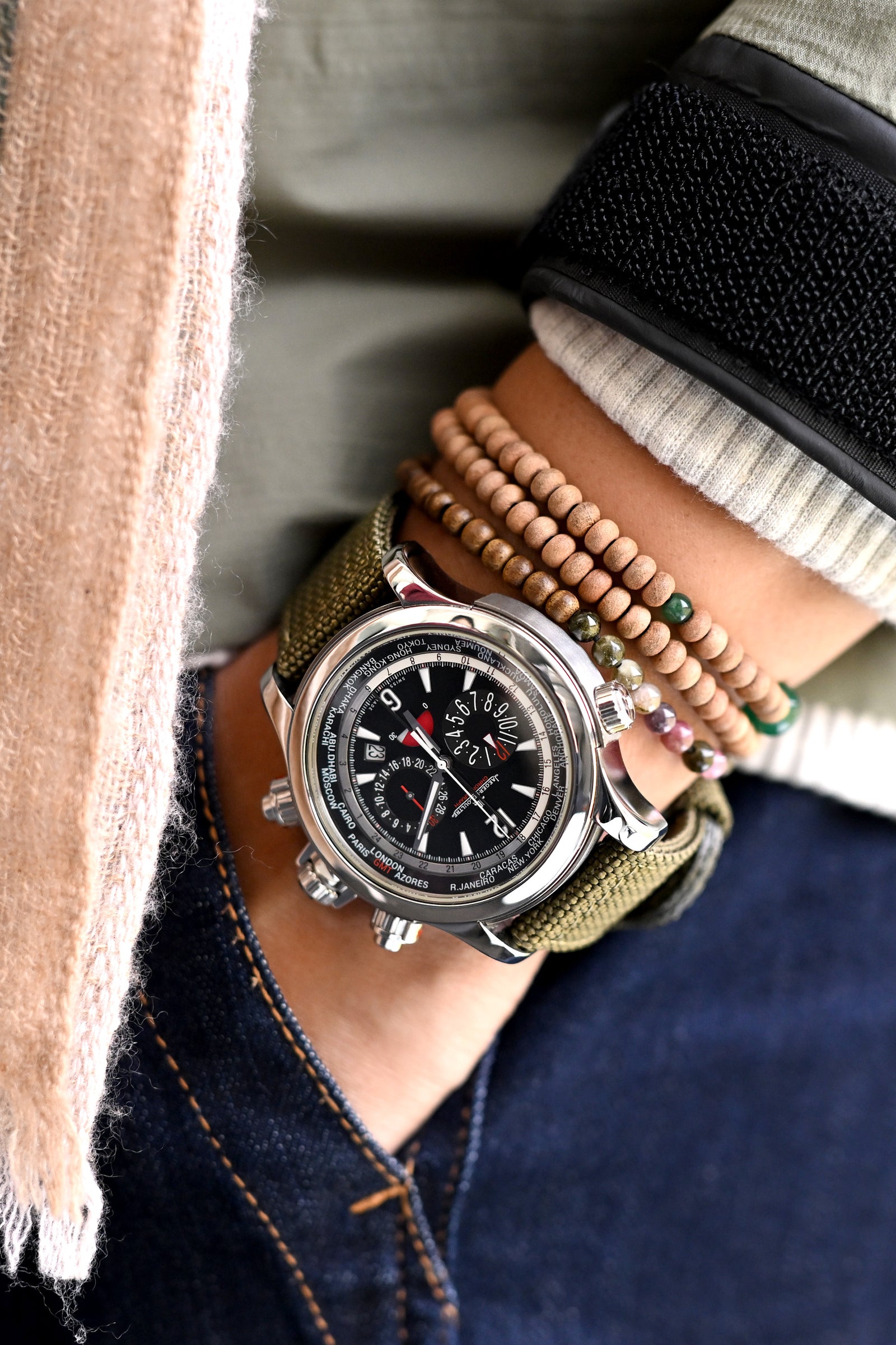 Expedition-ready luxury defined - the Jaeger LeCoultre Master Compressor Extreme World Chronograph's commanding presence softened by a plush cashmere touch with bold striped pattern, while the military green premium nylon watch strap introduces that tactical element, complemented by the natural double-layer cherry wood beads and aromatic agarwood accessories creating that perfect balance between rugged exploration and refined connoisseurship.