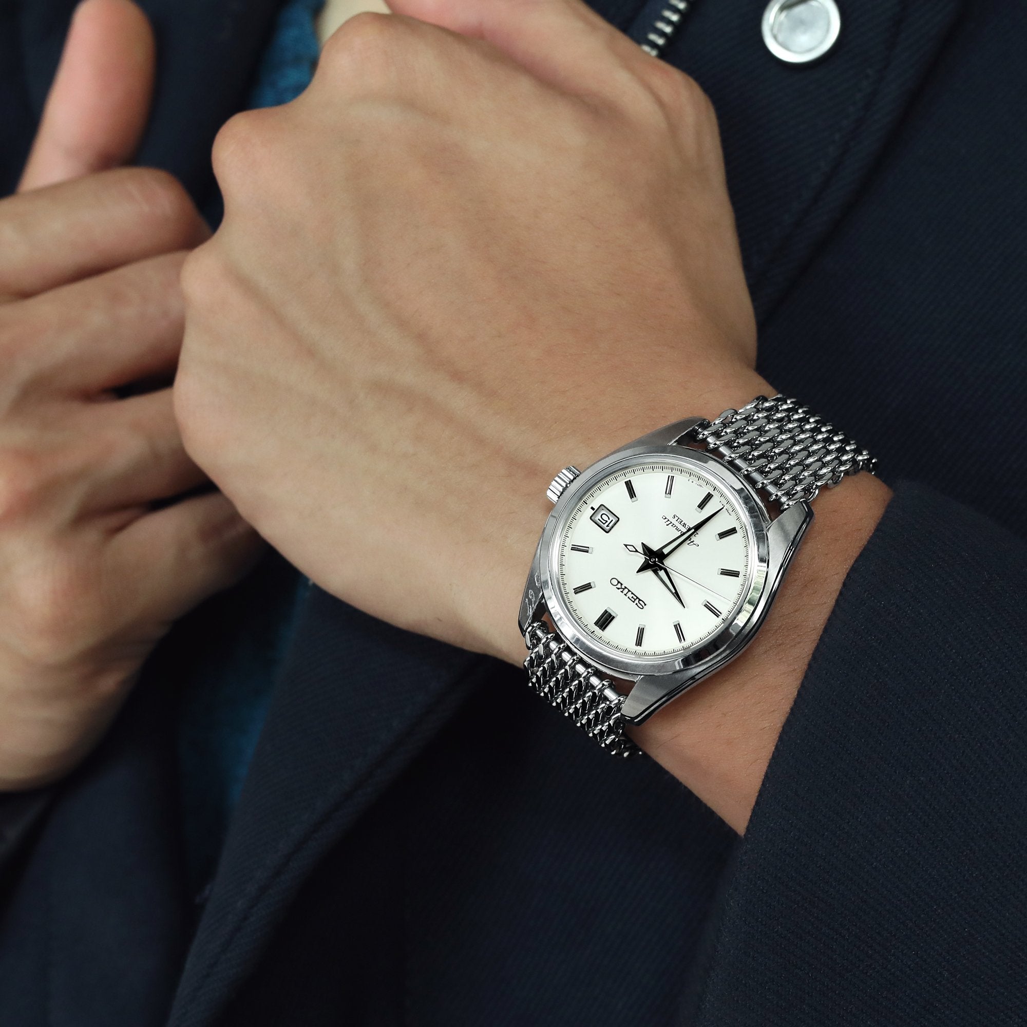 A new Tapered "SHARK" Mesh Band has been added to our MESH watch band collection. The taper starts out wider at the lugs and 4mm narrows toward the buckle. The amount of time it took to go through the designs and specifications for our new tapered "SHARK" mesh bracelets, the finished product took nearly twice as long since it had to go through the assembly line and quality control, as well as top tier craftsmanship throughout the entire process to ensure the very best in style and quality. Secured with V-Clasp double lock buttoned diver's clasp, solid 316L stainless steel buckle with push button have flexible fine-tune length adjustment up to 6 micro holes. Click the button 'Check your size' for our measurement guide of our recommended "Length range" for your best fit.