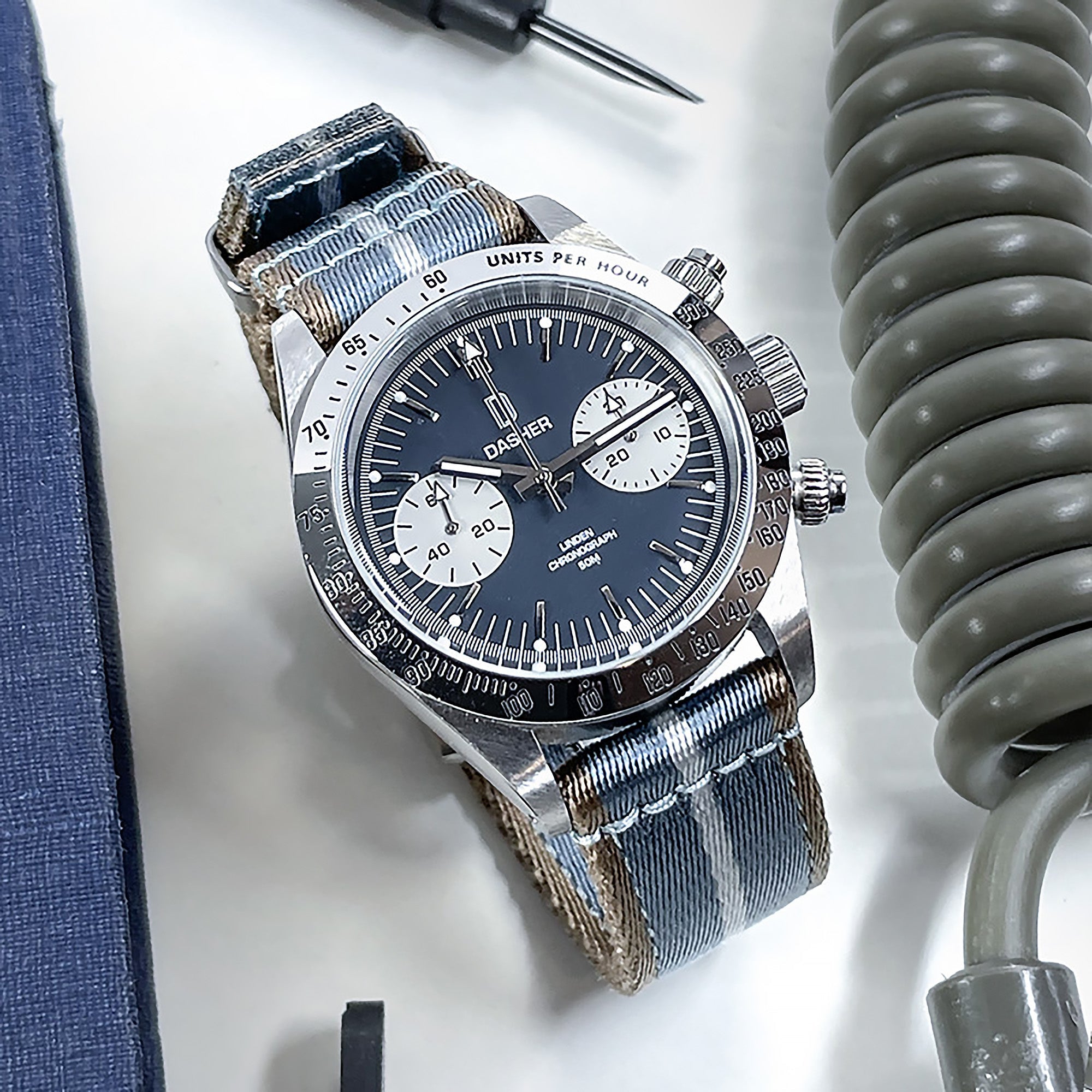 Based on the colour scheme of the cold war era digital urban camouflage pattern known as 'Berlin Camouflage', or 'Berlin Brigade' pattern. Berlin Brigade was established in 1982 by the British 4/7th Royal Dragoon Guards tank squadron in Berlin, after it was found that the traditional Olive Drab scheme was incompatible with its urban environment. Using a dispersed and scaled up digital pattern, the pattern was designed to merge with surrounding buildings, windows and doorways. Using a similar approach to the naval 'Dazzle Cam' pattern of visual disruption, to utilised 3 main tones of 'Brick Red', 'Slate Gray' and 'Marine Blue'. A lesser known and historically significant pattern which adopts a combination of unique subdued shades. Matches Dive and Field pieces, and general blue/ grey/ monotone timepieces.