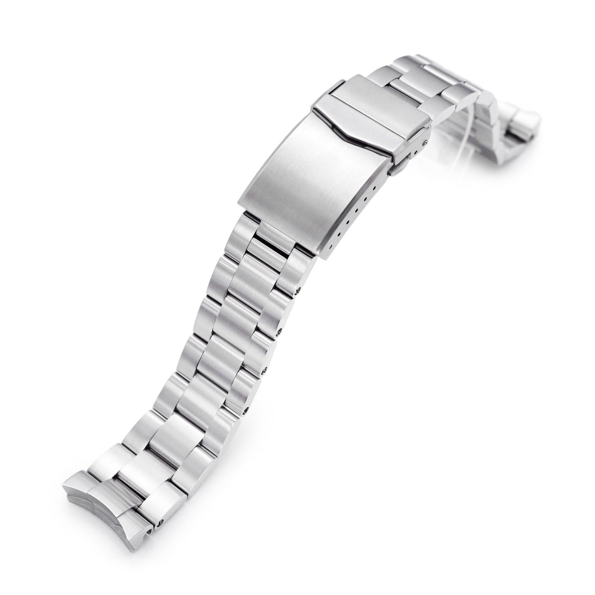 • This Super-O Boyer metal watch band is compatible with Seiko 5 40mm models which curved solid end pieces perfectly fit 2020 new Seiko 5 40mm divers : SRPE51, SRPE53, SRPE55, SRPE57, SRPE58, SRPE60, SRPE61, SRPE63 and SRPE67 Automatic Watches. Super-O Boyer watch band is a new breakthrough of our O Boyer Collection. Same as O Boyer, this Super-O Boyer composed of 3 flat and solid 316L stainless steel units plus highlighted 3D effect curved solid end pieces. This well-built replacement bracelet was assembled by screw-in adjustable details instead of flimsy pressure pins. Watch band is tapering to 18mm buckle width (compatible with original Seiko 18mm buckle, if you want to install your original Seiko clasp, please check the size of your Seiko clasp first). This item includes one pair of Dia. 2.5mm spring bar to ensure a more secure connection. Accompany with V-Clasp double lock buttoned diver's clasp. V-Clasp was made from solid 316L stainless steel with extra 6 micro holes for flexible fine tune length adjustment. Featured in V shape safety lock, streamlined form & chamfer edged design to giving a more massive look. Chamfer double locks diver's buckle is ideal for watch band with thickness approximate 4.0 - 5.0mm thickness. Super-O Boyer watch band with brushed finish is a good option of Seiko replacement watch band for your 40mm New Seiko 5 Sports SRPE models. This aftermarket durable stainless steel watch band is best compatible choice for Seiko 5 40mm SRPE51 and SRPE61.
